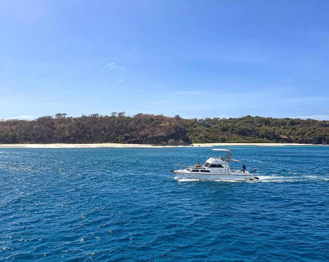 Clássico da manhã: navegação leve pela costa + parada ~40min pra banho na Baía do Sancho.